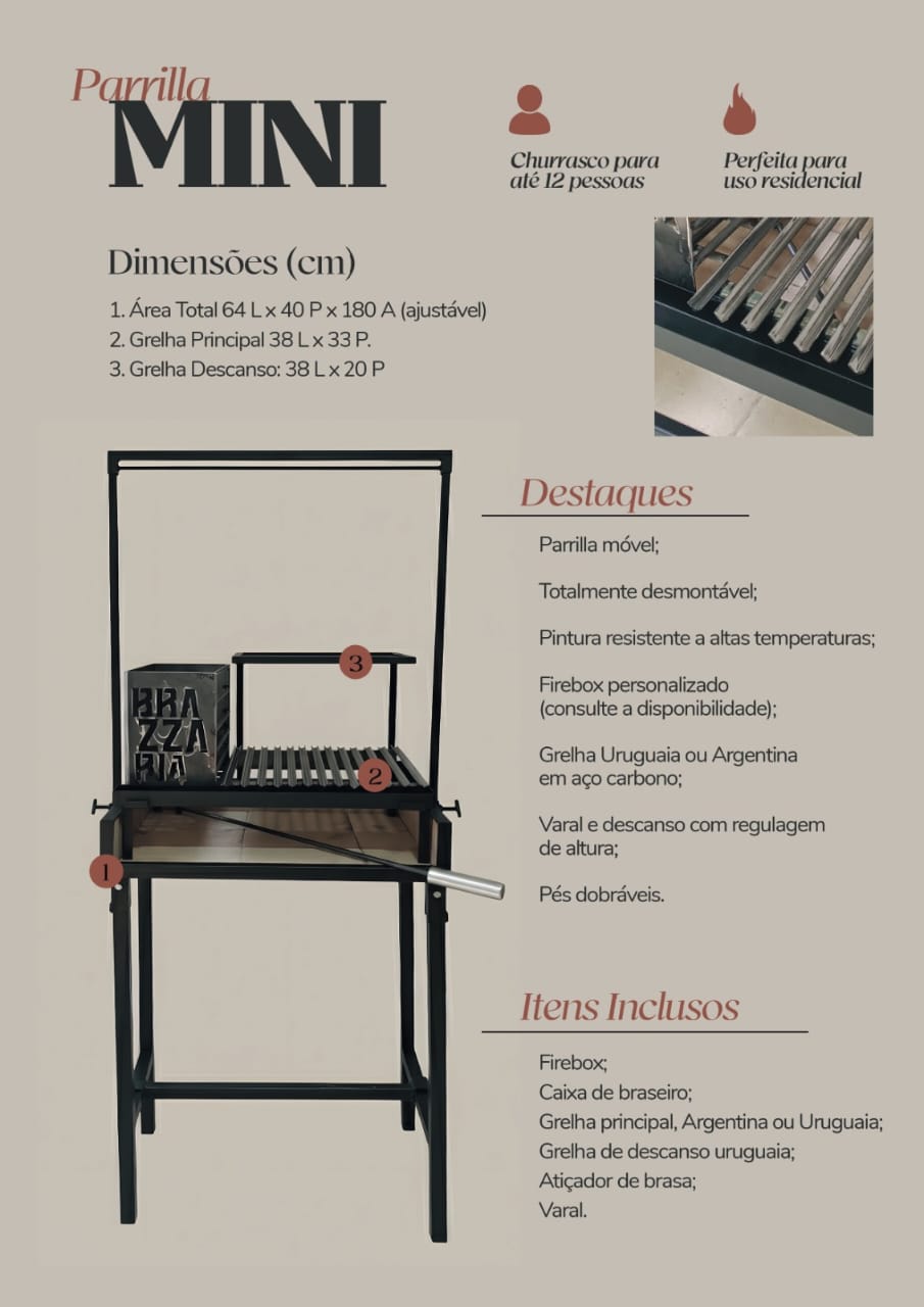 Nossa Parrilla Mini tem capacidade para atender até 12 pessoas. Tamanho ideal para uso residencial.