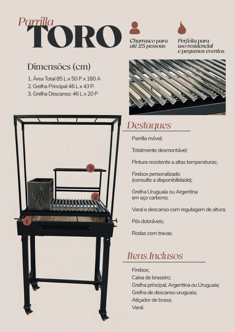 Nossa Parrilla Toro tem capacidade para atender até 25 pessoas. Tamanho ideal para uso residencial, ou eventos pequenos.